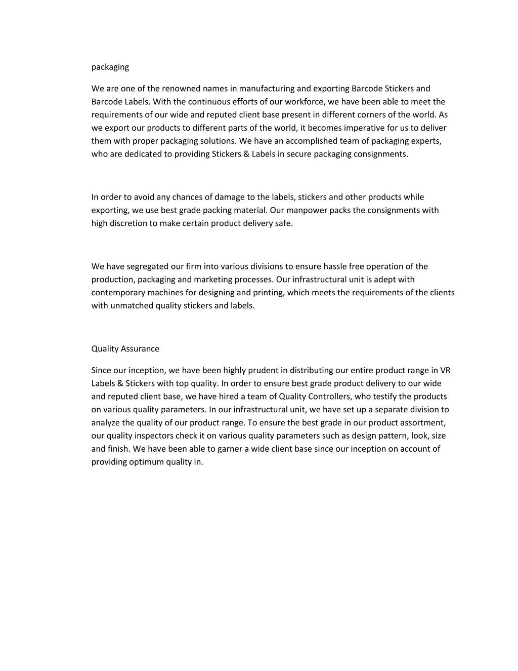 packaging We are one of the renowned names in manufacturing and exporting Barcode Stickers and Barcode Labels. With the continuous efforts of our workforce, we have been able to meet the requirements of our wide and reputed client base present in different corners of the world. As we export our products to different parts of the world, it becomes imperative for us to deliver them with proper packaging solutions. We have an accomplished team of packaging experts, who are dedicated to providing Stickers & Labels in secure packaging consignments. In order to avoid any chances of damage to the labels, stickers and other products while exporting, we use best grade packing material. Our manpower packs the consignments with high discretion to make certain product delivery safe. We have segregated our firm into various divisions to ensure hassle free operation of the production, packaging and marketing processes. Our infrastructural unit is adept with contemporary machines for designing and printing, which meets the requirements of the clients with unmatched quality stickers and labels. Quality Assurance Since our inception, we have been highly prudent in distributing our entire product range in VR Labels & Stickers with top quality. In order to ensure best grade product delivery to our wide and reputed client base, we have hired a team of Quality Controllers, who testify the products on various quality parameters. In our infrastructural unit, we have set up a separate division to analyze the quality of our product range. To ensure the best grade in our product assortment, our quality inspectors check it on various quality parameters such as design pattern, look, size and finish. We have been able to garner a wide client base since our inception on account of providing optimum quality in.