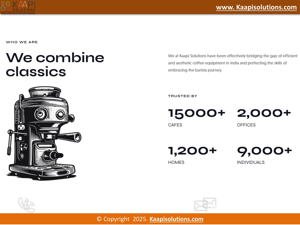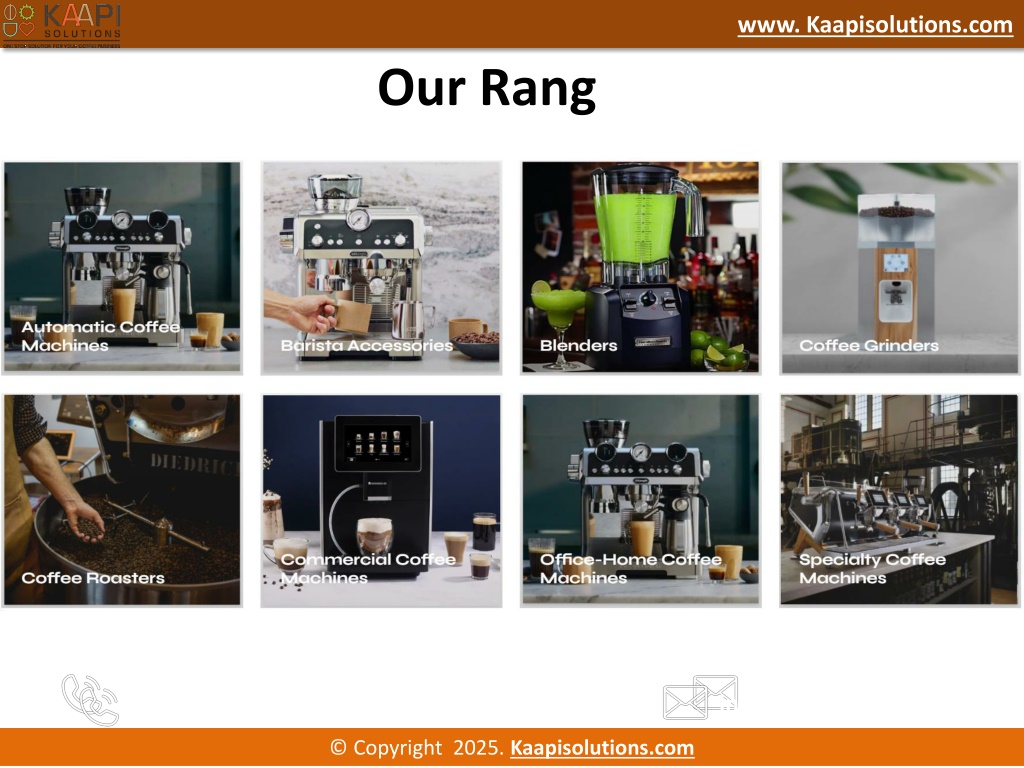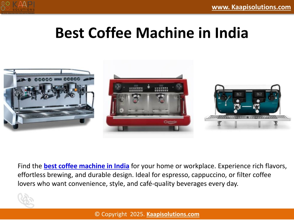 www. Kaapisolutions.com Best Coffee Machine in India • Find the best coffee machine in India for your home or workplace. Experience rich flavors, effortless brewing, and durable design. Ideal for espresso, cappuccino, or filter coffee lovers who want convenience, style, and café-quality beverages every day. +91- 80809-09980 +917042112297 © Copyright 2025. Kaapisolutions.com