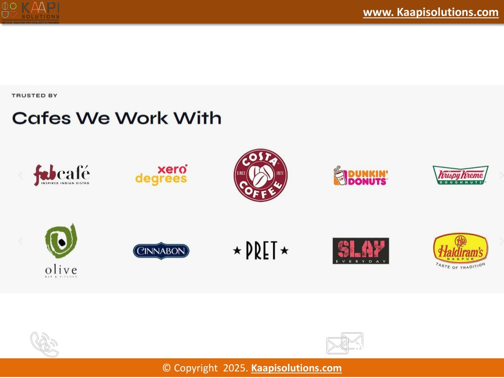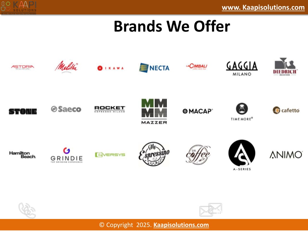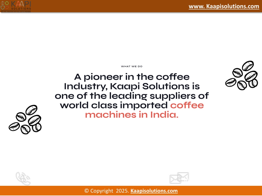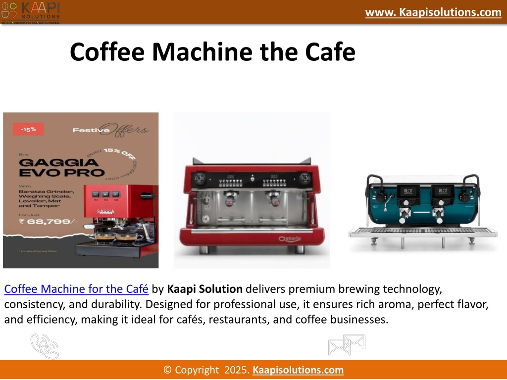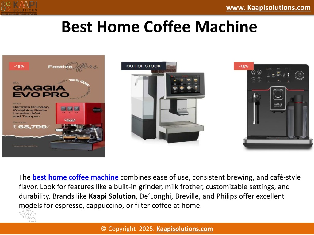 www. Kaapisolutions.com Best Home Coffee Machine • The best home coffee machine combines ease of use, consistent brewing, and café-style flavor. Look for features like a built-in grinder, milk frother, customizable settings, and durability. Brands like Kaapi Solution, De’Longhi, Breville, and Philips offer excellent models for espresso, cappuccino, or filter coffee at home. +91- 80809-09980 +917042112297 © Copyright 2025. Kaapisolutions.com
