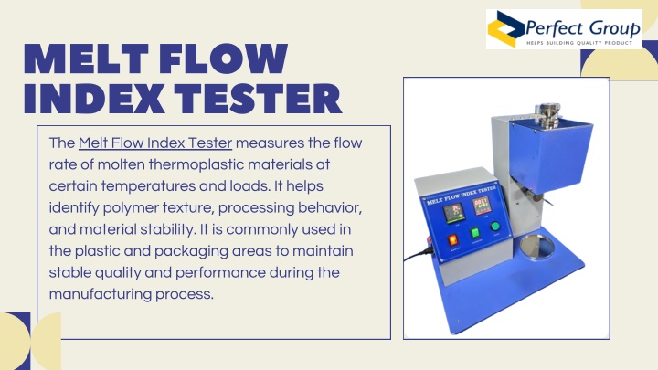1. MELT FLOW INDEX TESTER The Melt Flow Index Tester measures the flow rate of molten thermoplastic materials at certain temperatures and loads. It helps identify polymer texture, processing behavior, and material stability. It is commonly used in the plastic and packaging areas to maintain stable quality and performance during the manufacturing process.
