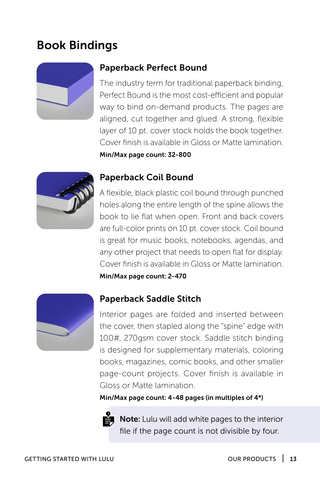 Book Bindings Paperback Perfect Bound The industry term for traditional paperback binding, Perfect Bound is the most cost-efficient and popular way to bind on-demand products. The pages are aligned, cut together and glued. A strong, flexible layer of 10 pt. cover stock holds the book together. Cover finish is available in Gloss or Matte lamination. Min/Max page count: 32-800 Paperback Coil Bound A flexible, black plastic coil bound through punched holes along the entire length of the spine allows the book to lie flat when open. Front and back covers are full-color prints on 10 pt. cover stock. Coil bound is great for music books, notebooks, agendas, and any other project that needs to open flat for display. Cover finish is available in Gloss or Matte lamination. Min/Max page count: 2-470 Paperback Saddle Stitch Interior pages are folded and inserted between the cover, then stapled along the “spine” edge with 100#, 270gsm cover stock. Saddle stitch binding is designed for supplementary materials, coloring books, magazines, comic books, and other smaller page-count projects. Cover finish is available in Gloss or Matte lamination. Min/Max page count: 4-48 pages (in multiples of 4*) Note: Lulu will add white pages to the interior file if the page count is not divisible by four. 13 GETTING STARTED WITH LULU OUR PRODUCTS