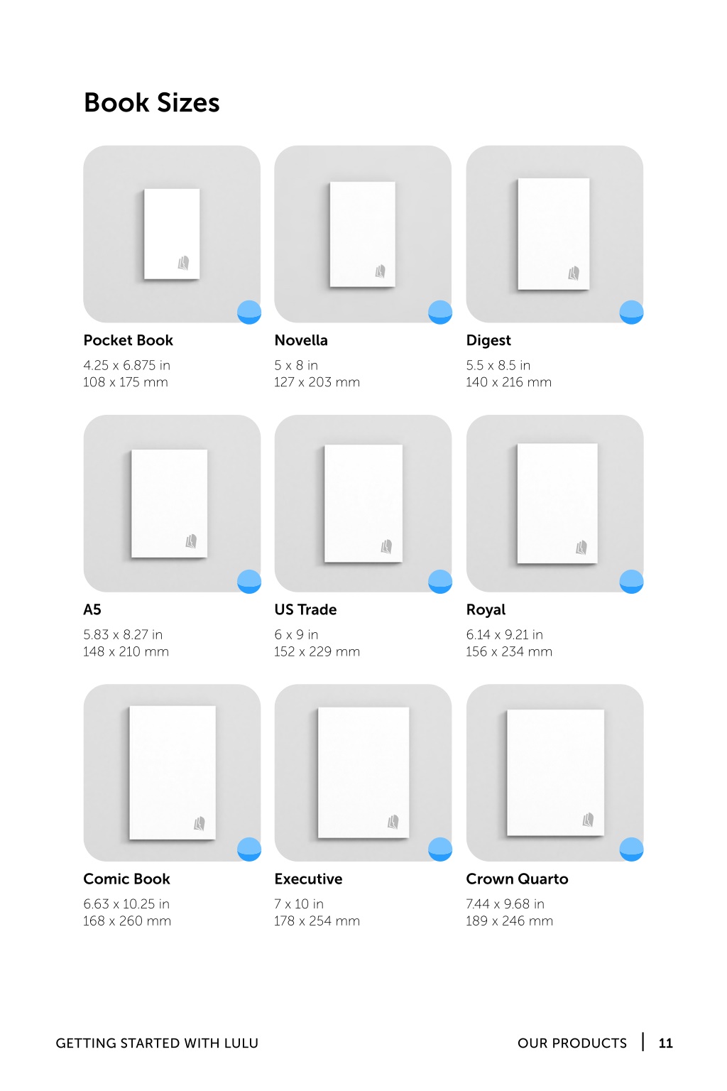 Book Sizes Pocket Book Novella Digest 4.25 x 6.875 in 108 x 175 mm 5 x 8 in 127 x 203 mm 5.5 x 8.5 in 140 x 216 mm A5 US Trade Royal 5.83 x 8.27 in 148 x 210 mm 6 x 9 in 152 x 229 mm 6.14 x 9.21 in 156 x 234 mm Comic Book Executive Crown Quarto 6.63 x 10.25 in 168 x 260 mm 7 x 10 in 178 x 254 mm 7.44 x 9.68 in 189 x 246 mm 11 GETTING STARTED WITH LULU OUR PRODUCTS