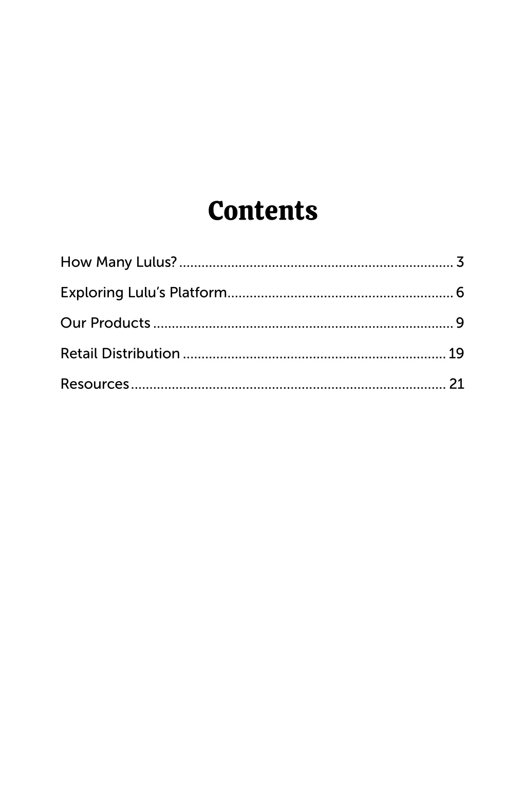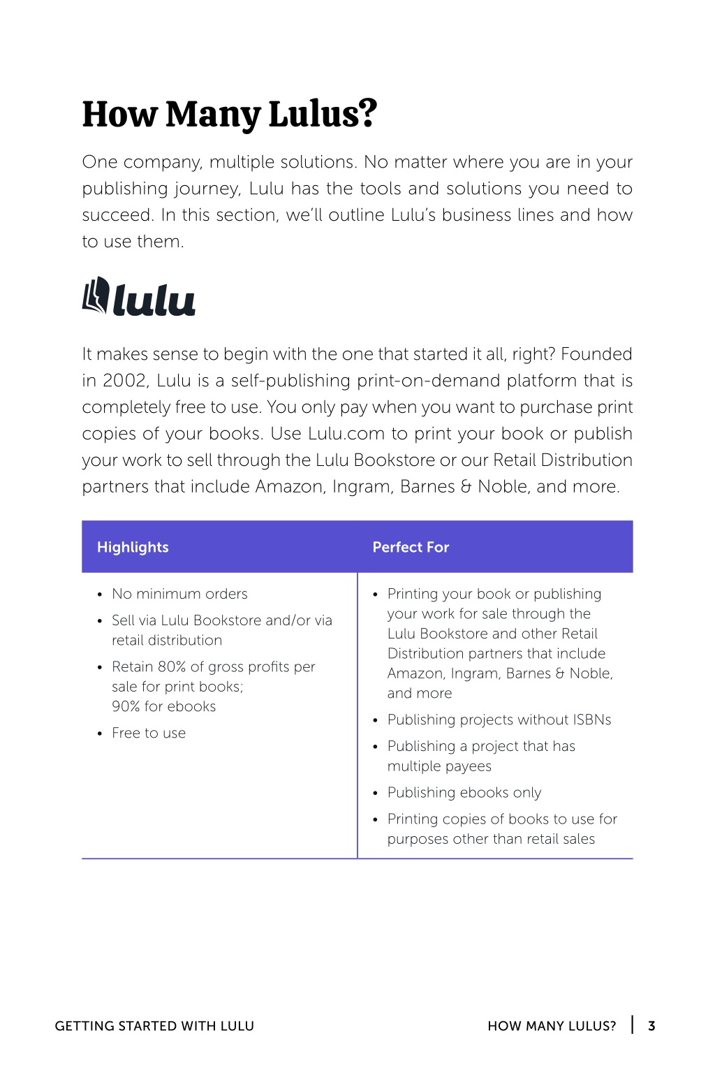 How Many Lulus? One company, multiple solutions. No matter where you are in your publishing journey, Lulu has the tools and solutions you need to succeed. In this section, we’ll outline Lulu’s business lines and how to use them. It makes sense to begin with the one that started it all, right? Founded in 2002, Lulu is a self-publishing print-on-demand platform that is completely free to use. You only pay when you want to purchase print copies of your books. Use Lulu.com to print your book or publish your work to sell through the Lulu Bookstore or our Retail Distribution partners that include Amazon, Ingram, Barnes & Noble, and more. Highlights Perfect For • No minimum orders • Printing your book or publishing your work for sale through the Lulu Bookstore and other Retail Distribution partners that include Amazon, Ingram, Barnes & Noble, and more • Sell via Lulu Bookstore and/or via retail distribution • Retain 80% of gross profits per sale for print books; 90% for ebooks • Publishing projects without ISBNs • Free to use • Publishing a project that has multiple payees • Publishing ebooks only • Printing copies of books to use for purposes other than retail sales 3 GETTING STARTED WITH LULU HOW MANY LULUS?