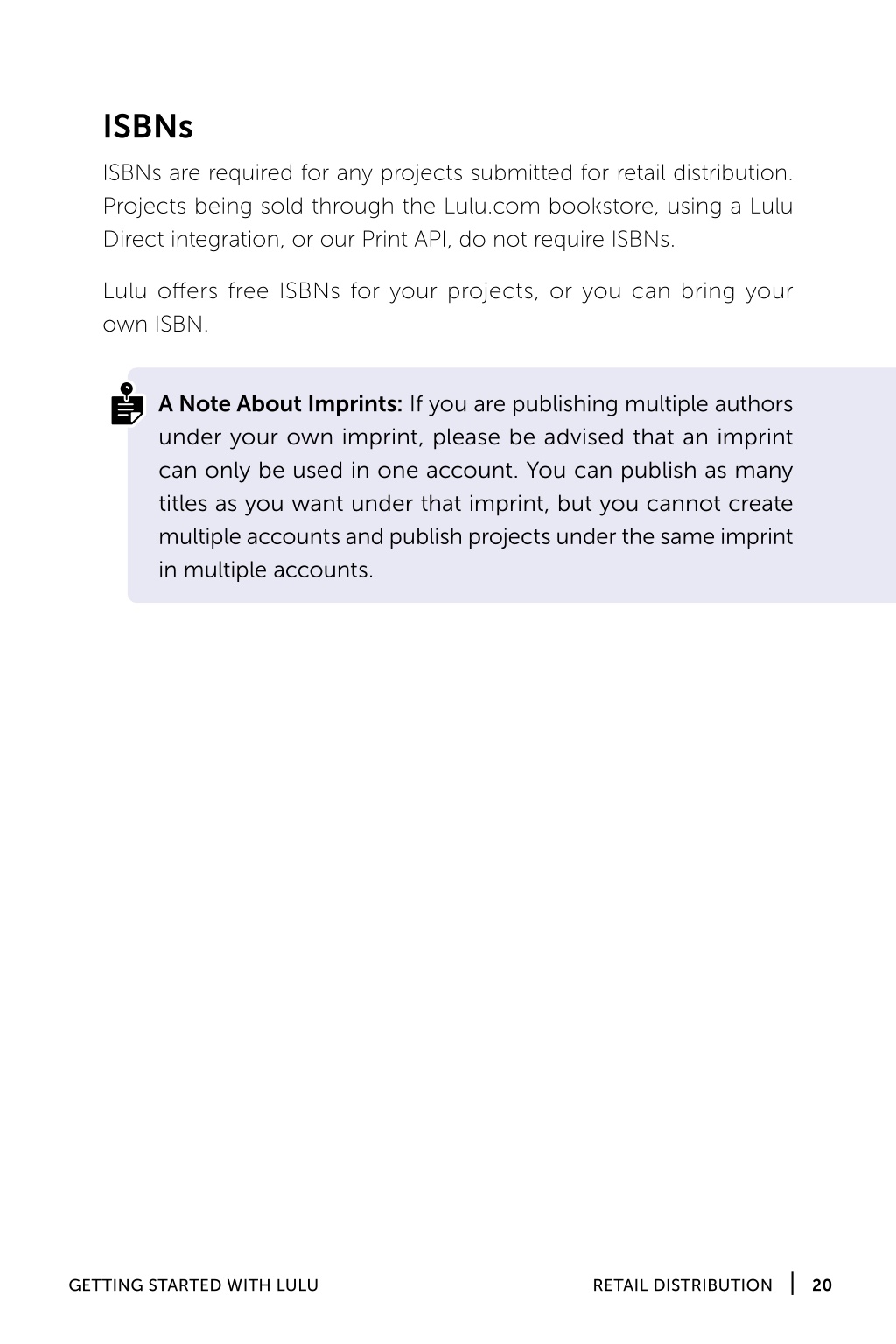 ISBNs ISBNs are required for any projects submitted for retail distribution. Projects being sold through the Lulu.com bookstore, using a Lulu Direct integration, or our Print API, do not require ISBNs. Lulu offers free ISBNs for your projects, or you can bring your own ISBN. A Note About Imprints: If you are publishing multiple authors under your own imprint, please be advised that an imprint can only be used in one account. You can publish as many titles as you want under that imprint, but you cannot create multiple accounts and publish projects under the same imprint in multiple accounts. 20 GETTING STARTED WITH LULU RETAIL DISTRIBUTION
