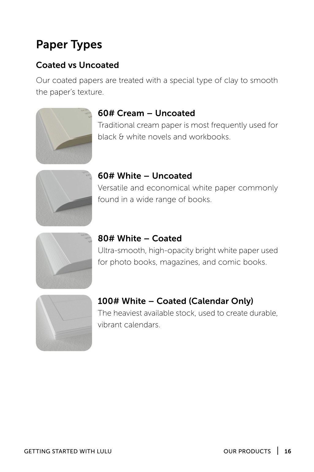 Paper Types Coated vs Uncoated Our coated papers are treated with a special type of clay to smooth the paper’s texture. 60# Cream – Uncoated Traditional cream paper is most frequently used for black & white novels and workbooks. 60# White – Uncoated Versatile and economical white paper commonly found in a wide range of books. 80# White – Coated Ultra-smooth, high-opacity bright white paper used for photo books, magazines, and comic books. 100# White – Coated (Calendar Only) The heaviest available stock, used to create durable, vibrant calendars. 16 GETTING STARTED WITH LULU OUR PRODUCTS