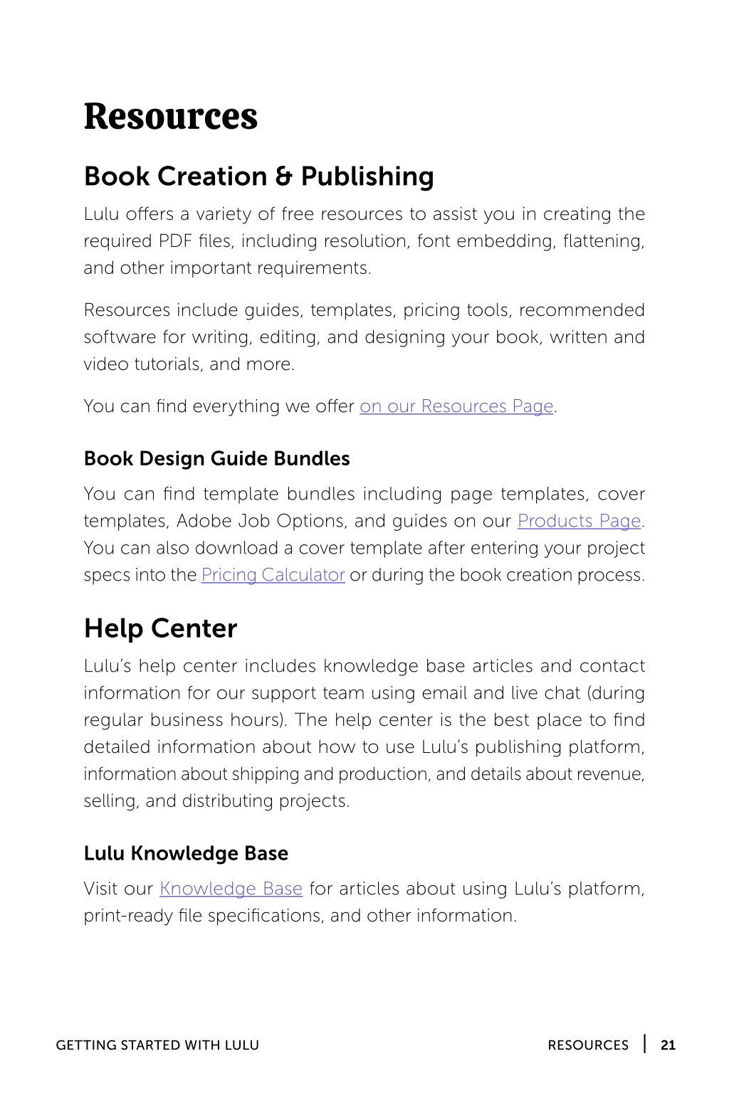 Resources Book Creation & Publishing Lulu offers a variety of free resources to assist you in creating the required PDF files, including resolution, font embedding, flattening, and other important requirements. Resources include guides, templates, pricing tools, recommended software for writing, editing, and designing your book, written and video tutorials, and more. You can find everything we offer on our Resources Page. Book Design Guide Bundles You can find template bundles including page templates, cover templates, Adobe Job Options, and guides on our Products Page. You can also download a cover template after entering your project specs into the Pricing Calculator or during the book creation process. Help Center Lulu’s help center includes knowledge base articles and contact information for our support team using email and live chat (during regular business hours). The help center is the best place to find detailed information about how to use Lulu’s publishing platform, information about shipping and production, and details about revenue, selling, and distributing projects. Lulu Knowledge Base Visit our Knowledge Base for articles about using Lulu’s platform, print-ready file specifications, and other information. 21 GETTING STARTED WITH LULU RESOURCES