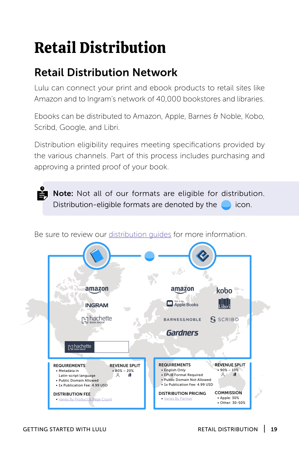 Retail Distribution Retail Distribution Network Lulu can connect your print and ebook products to retail sites like Amazon and to Ingram’s network of 40,000 bookstores and libraries. Ebooks can be distributed to Amazon, Apple, Barnes & Noble, Kobo, Scribd, Google, and Libri. Distribution eligibility requires meeting specifications provided by the various channels. Part of this process includes purchasing and approving a printed proof of your book. Note: Not all of our formats are eligible for distribution. Distribution-eligible formats are denoted by the icon. Be sure to review our distribution guides for more information. REQUIREMENTS • English Only • EPUB Format Required • Public Domain Not Allowed • 1x Publication Fee: 4.99 USD REVENUE SPLIT • 90% – 10% REQUIREMENTS • Metadata in Latin-script language • Public Domain Allowed • 1x Publication Fee: 4.99 USD REVENUE SPLIT • 80% – 20% COMMISSION • Apple: 30% • Other: 30-50% DISTRIBUTION PRICING • Varies By Partner DISTRIBUTION FEE • Varies By Product & Page Count 19 GETTING STARTED WITH LULU RETAIL DISTRIBUTION