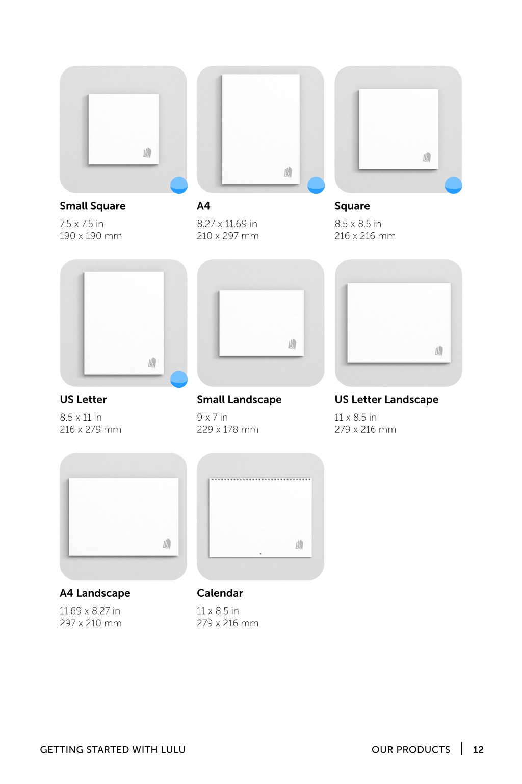 Small Square A4 Square 7.5 x 7.5 in 190 x 190 mm 8.27 x 11.69 in 210 x 297 mm 8.5 x 8.5 in 216 x 216 mm US Letter Small Landscape US Letter Landscape 8.5 x 11 in 216 x 279 mm 9 x 7 in 229 x 178 mm 11 x 8.5 in 279 x 216 mm A4 Landscape Calendar 11.69 x 8.27 in 297 x 210 mm 11 x 8.5 in 279 x 216 mm 12 GETTING STARTED WITH LULU OUR PRODUCTS