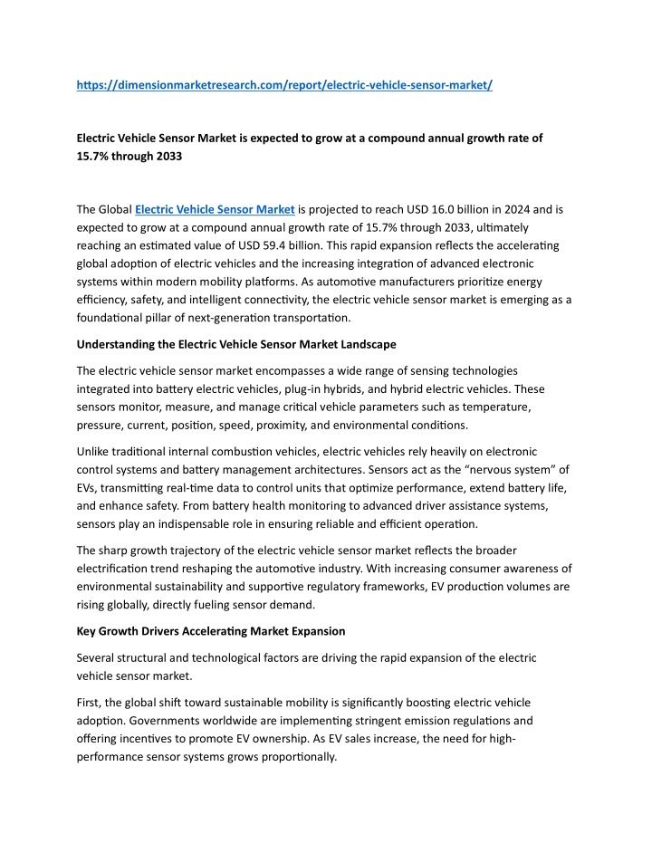 The Global Electric Vehicle Sensor Market is projected to reach USD 16.0 billion in 2024 and is expected to grow at a compound annual growth rate of 15.7% through 2033, ultimately reaching an estimated value of USD 59.4 billion. <br><br>Read More Information: https://dimensionmarketresearch.com/report/electric-vehicle-sensor-market/
