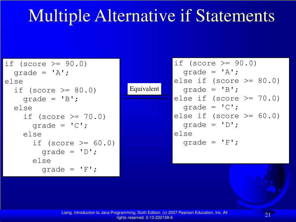 animation Trace if-else statement Suppose score is 70.0 Exit the if statement if (score >= 90.0) grade = 'A'; else if (score >= 80.0) grade = 'B'; else if (score >= 70.0) grade = 'C'; else if (score >= 60.0) grade = 'D'; else grade = 'F';