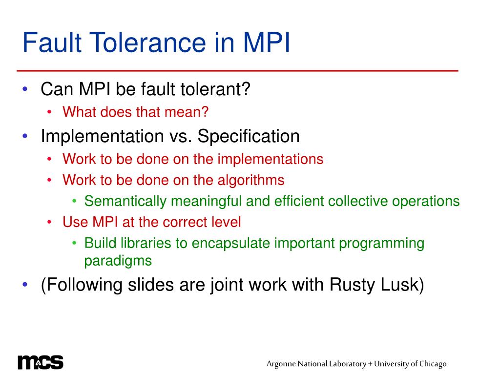 Fault Tolerance in MPI • Can MPI be fault tolerant? • What does that mean? • Implementation vs. Specification • Work to be done on the implementations • Work to be done on the algorithms • Semantically meaningful and efficient collective operations • Use MPI at the correct level • Build libraries to encapsulate important programming paradigms • (Following slides are joint work with Rusty Lusk)