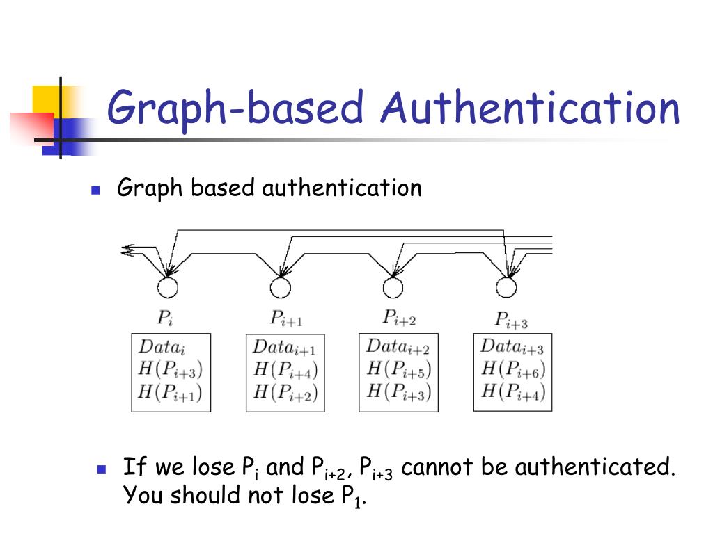 Graph-based Authentication • Graph based authentication • If we lose Pi and Pi+2, Pi+3 cannot be authenticated. You should not lose P1.