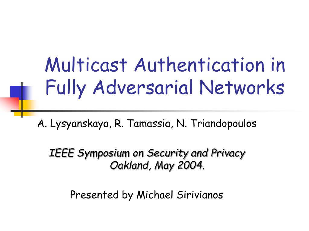 Multicast Authentication in Fully Adversarial Networks A. Lysyanskaya, R. Tamassia, N. Triandopoulos IEEE Symposium on Security and Privacy Oakland, May 2004. Presented by Michael Sirivianos