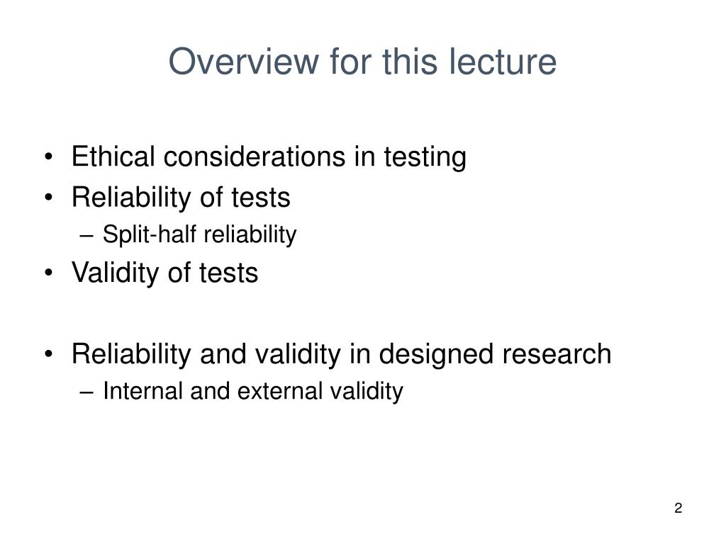 Overview for this lecture • Ethical considerations in testing • Reliability of tests • Split-half reliability • Validity of tests • Reliability and validity in designed research • Internal and external validity