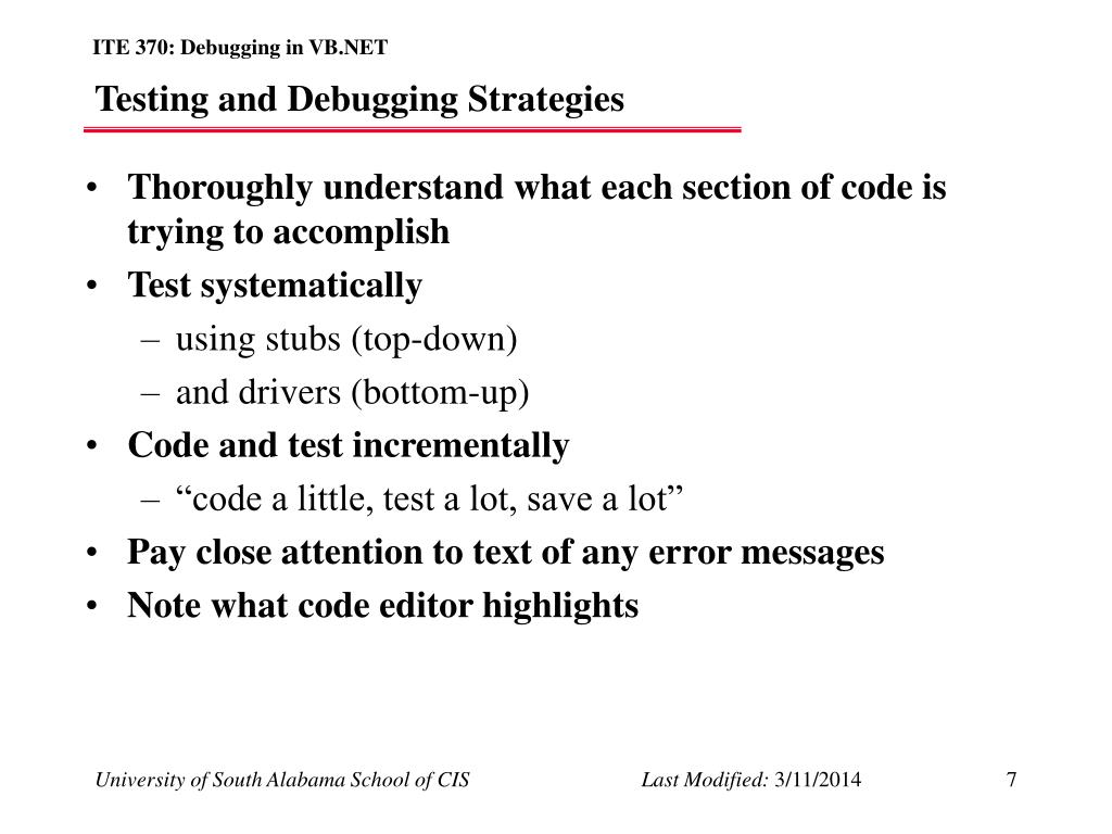 Testing and Debugging Strategies (cont.) • Use debugging tools and/or message boxes to examine the results of actions • Understand the state of variables, controls, and files and databases at the time of the error • prior conditions contribute to problem • example: use of .Read method failed because end-of-file condition was already true • Get someone else to run your program • they might test something you didn’t think of • Test how your program handles errors • Exception handling University of South Alabama School of CIS