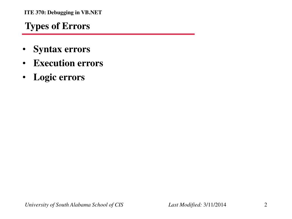 Types of Errors • Syntax errors • Execution errors • Logic errors University of South Alabama School of CIS