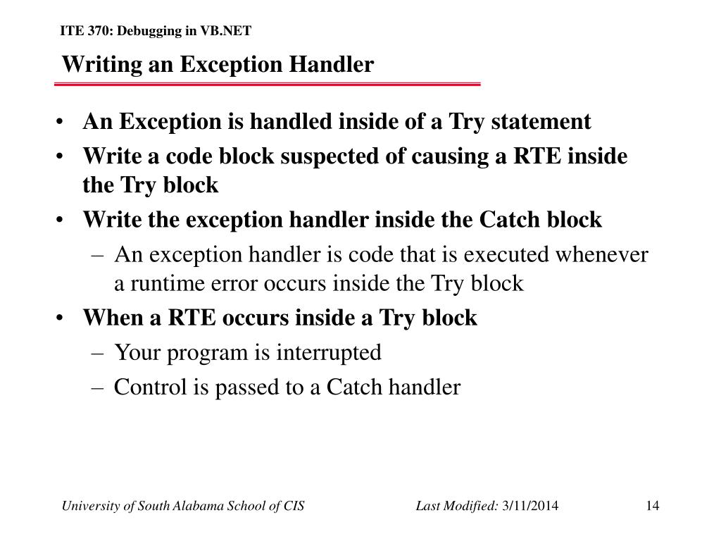 Writing an Exception Handler • An Exception is handled inside of a Try statement • Write a code block suspected of causing a RTE inside the Try block • Write the exception handler inside the Catch block • An exception handler is code that is executed whenever a runtime error occurs inside the Try block • When a RTE occurs inside a Try block • Your program is interrupted • Control is passed to a Catch handler University of South Alabama School of CIS