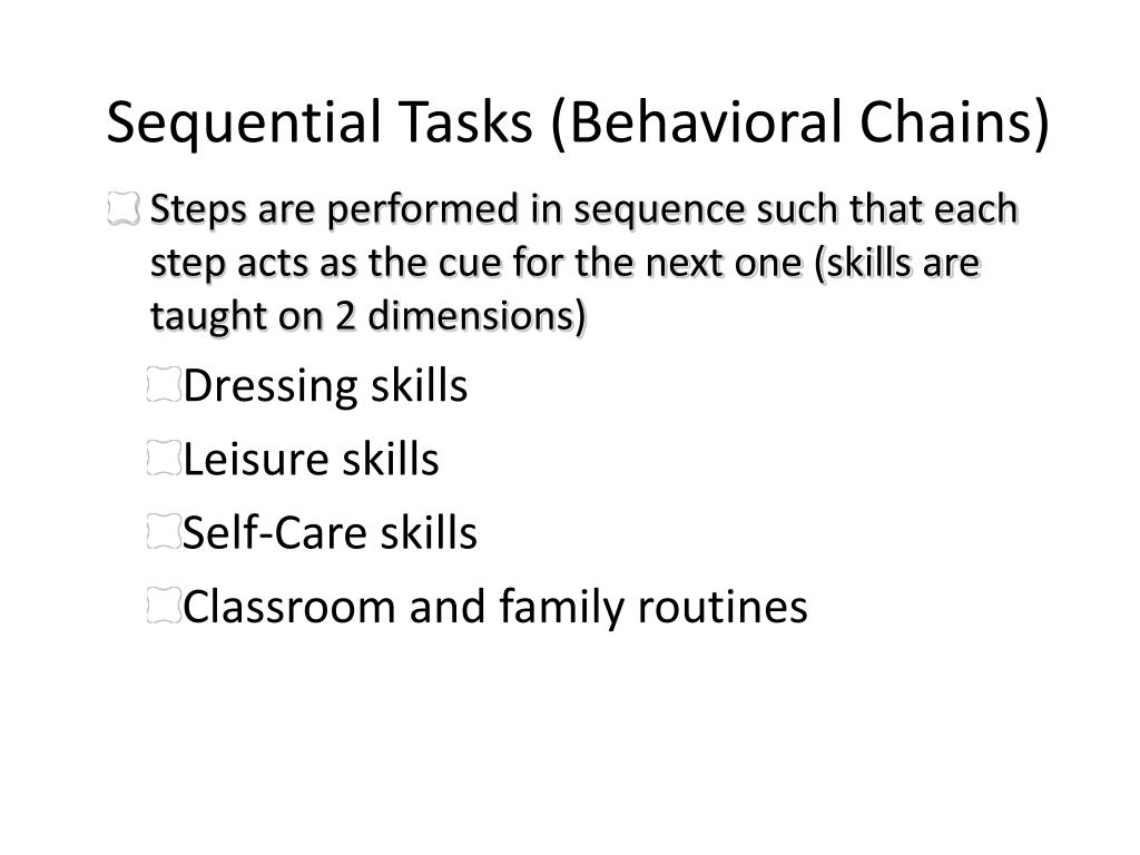 Sequential Tasks (Behavioral Chains) • Steps are performed in sequence such that each step acts as the cue for the next one (skills are taught on 2 dimensions) • Dressing skills • Leisure skills • Self-Care skills • Classroom and family routines