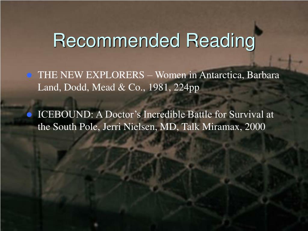 Recommended Reading • THE NEW EXPLORERS – Women in Antarctica, Barbara Land, Dodd, Mead & Co., 1981, 224pp • ICEBOUND: A Doctor’s Incredible Battle for Survival at the South Pole, Jerri Nielsen, MD, Talk Miramax, 2000
