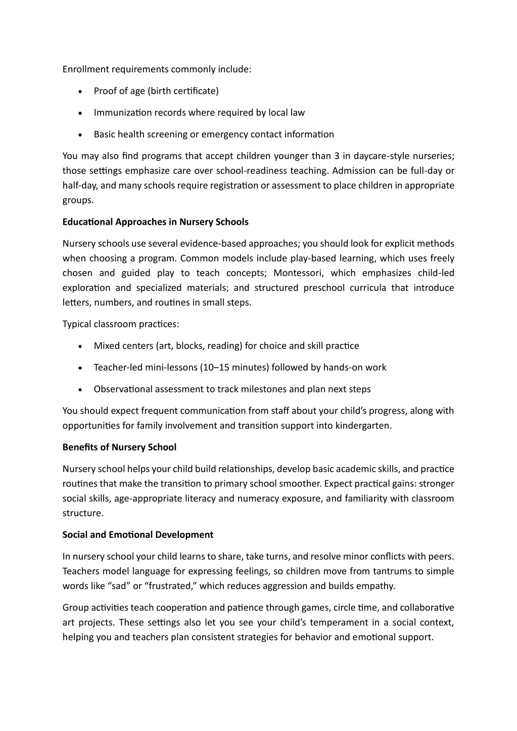 Enrollment requirements commonly include: •Proof of age (birth certificate) •Immunization records where required by local law •Basic health screening or emergency contact information You may also find programs that accept children younger than 3 in daycare-style nurseries; those settings emphasize care over school-readiness teaching. Admission can be full-day or half-day, and many schools require registration or assessment to place children in appropriate groups. Educational Approaches in Nursery Schools Nursery schools use several evidence-based approaches; you should look for explicit methods when choosing a program. Common models include play-based learning, which uses freely chosen and guided play to teach concepts; Montessori, which emphasizes child-led exploration and specialized materials; and structured preschool curricula that introduce letters, numbers, and routines in small steps. Typical classroom practices: •Mixed centers (art, blocks, reading) for choice and skill practice •Teacher-led mini-lessons (10–15 minutes) followed by hands-on work •Observational assessment to track milestones and plan next steps You should expect frequent communication from staff about your child’s progress, along with opportunities for family involvement and transition support into kindergarten. Benefits of Nursery School Nursery school helps your child build relationships, develop basic academic skills, and practice routines that make the transition to primary school smoother. Expect practical gains: stronger social skills, age-appropriate literacy and numeracy exposure, and familiarity with classroom structure. Social and Emotional Development In nursery school your child learns to share, take turns, and resolve minor conflicts with peers. Teachers model language for expressing feelings, so children move from tantrums to simple words like “sad” or “frustrated,” which reduces aggression and builds empathy. Group activities teach cooperation and patience through games, circle time, and collaborative art projects. These settings also let you see your child’s temperament in a social context, helping you and teachers plan consistent strategies for behavior and emotional support.