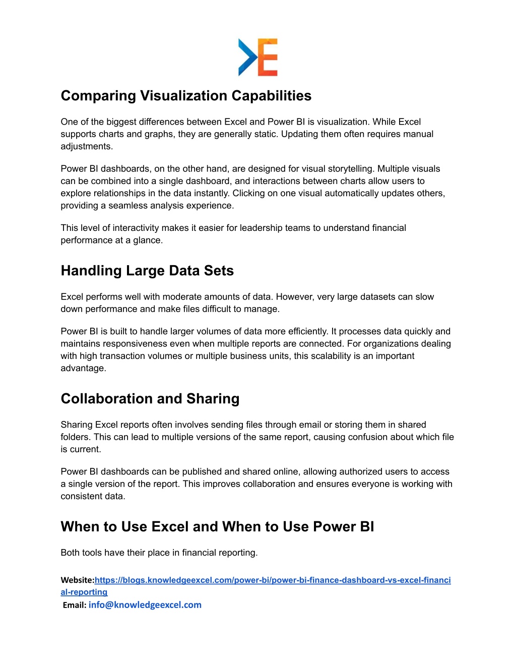 Comparing Visualization Capabilities One of the biggest differences between Excel and Power BI is visualization. While Excel supports charts and graphs, they are generally static. Updating them often requires manual adjustments. Power BI dashboards, on the other hand, are designed for visual storytelling. Multiple visuals can be combined into a single dashboard, and interactions between charts allow users to explore relationships in the data instantly. Clicking on one visual automatically updates others, providing a seamless analysis experience. This level of interactivity makes it easier for leadership teams to understand financial performance at a glance. Handling Large Data Sets Excel performs well with moderate amounts of data. However, very large datasets can slow down performance and make files difficult to manage. Power BI is built to handle larger volumes of data more efficiently. It processes data quickly and maintains responsiveness even when multiple reports are connected. For organizations dealing with high transaction volumes or multiple business units, this scalability is an important advantage. Collaboration and Sharing Sharing Excel reports often involves sending files through email or storing them in shared folders. This can lead to multiple versions of the same report, causing confusion about which file is current. Power BI dashboards can be published and shared online, allowing authorized users to access a single version of the report. This improves collaboration and ensures everyone is working with consistent data. When to Use Excel and When to Use Power BI Both tools have their place in financial reporting. Website:https://blogs.knowledgeexcel.com/power-bi/power-bi-finance-dashboard-vs-excel-financi al-reporting Email: info@knowledgeexcel.com