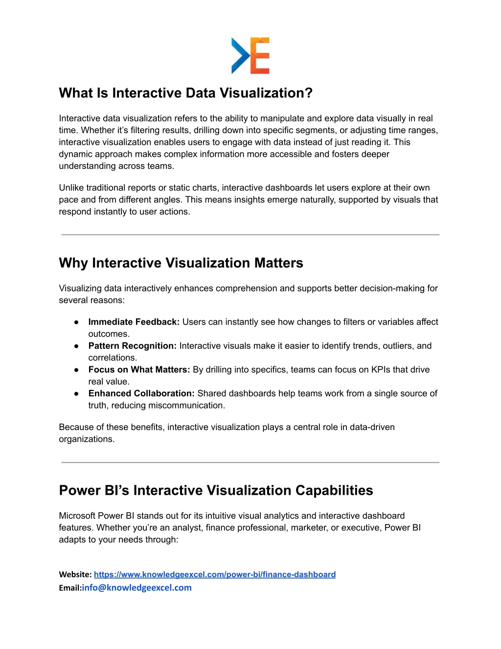 What Is Interactive Data Visualization? Interactive data visualization refers to the ability to manipulate and explore data visually in real time. Whether it’s filtering results, drilling down into specific segments, or adjusting time ranges, interactive visualization enables users to engage with data instead of just reading it. This dynamic approach makes complex information more accessible and fosters deeper understanding across teams. Unlike traditional reports or static charts, interactive dashboards let users explore at their own pace and from different angles. This means insights emerge naturally, supported by visuals that respond instantly to user actions. Why Interactive Visualization Matters Visualizing data interactively enhances comprehension and supports better decision-making for several reasons: ● Immediate Feedback: Users can instantly see how changes to filters or variables affect outcomes. ● Pattern Recognition: Interactive visuals make it easier to identify trends, outliers, and correlations. ● Focus on What Matters: By drilling into specifics, teams can focus on KPIs that drive real value. ● Enhanced Collaboration: Shared dashboards help teams work from a single source of truth, reducing miscommunication. Because of these benefits, interactive visualization plays a central role in data-driven organizations. Power BI’s Interactive Visualization Capabilities Microsoft Power BI stands out for its intuitive visual analytics and interactive dashboard features. Whether you’re an analyst, finance professional, marketer, or executive, Power BI adapts to your needs through: Website: https://www.knowledgeexcel.com/power-bi/finance-dashboard Email:info@knowledgeexcel.com