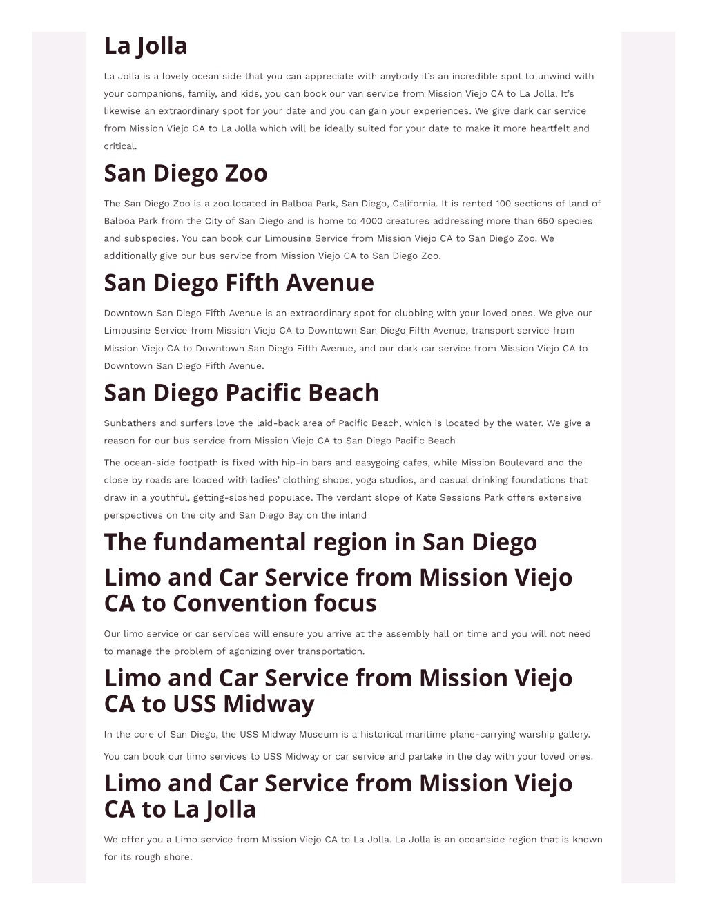 La Jolla La Jolla is a lovely ocean side that you can appreciate with anybody it’s an incredible spot to unwind with your companions, family, and kids, you can book our van service from Mission Viejo CA to La Jolla. It’s likewise an extraordinary spot for your date and you can gain your experiences. We give dark car service from Mission Viejo CA to La Jolla which will be ideally suited for your date to make it more heartfelt and critical. San Diego Zoo The San Diego Zoo is a zoo located in Balboa Park, San Diego, California. It is rented 100 sections of land of Balboa Park from the City of San Diego and is home to 4000 creatures addressing more than 650 species and subspecies. You can book our Limousine Service from Mission Viejo CA to San Diego Zoo. We additionally give our bus service from Mission Viejo CA to San Diego Zoo. San Diego Fifth Avenue Downtown San Diego Fifth Avenue is an extraordinary spot for clubbing with your loved ones. We give our Limousine Service from Mission Viejo CA to Downtown San Diego Fifth Avenue, transport service from Mission Viejo CA to Downtown San Diego Fifth Avenue, and our dark car service from Mission Viejo CA to Downtown San Diego Fifth Avenue. San Diego Paci?c Beach Sunbathers and surfers love the laid-back area of Paci?c Beach, which is located by the water. We give a reason for our bus service from Mission Viejo CA to San Diego Paci?c Beach The ocean-side footpath is ?xed with hip-in bars and easygoing cafes, while Mission Boulevard and the close by roads are loaded with ladies’ clothing shops, yoga studios, and casual drinking foundations that draw in a youthful, getting-sloshed populace. The verdant slope of Kate Sessions Park o?ers extensive perspectives on the city and San Diego Bay on the inland The fundamental region in San Diego Limo and Car Service from Mission Viejo CA to Convention focus Our limo service or car services will ensure you arrive at the assembly hall on time and you will not need to manage the problem of agonizing over transportation. Limo and Car Service from Mission Viejo CA to USS Midway In the core of San Diego, the USS Midway Museum is a historical maritime plane-carrying warship gallery. You can book our limo services to USS Midway or car service and partake in the day with your loved ones. Limo and Car Service from Mission Viejo CA to La Jolla We o?er you a Limo service from Mission Viejo CA to La Jolla. La Jolla is an oceanside region that is known for its rough shore.