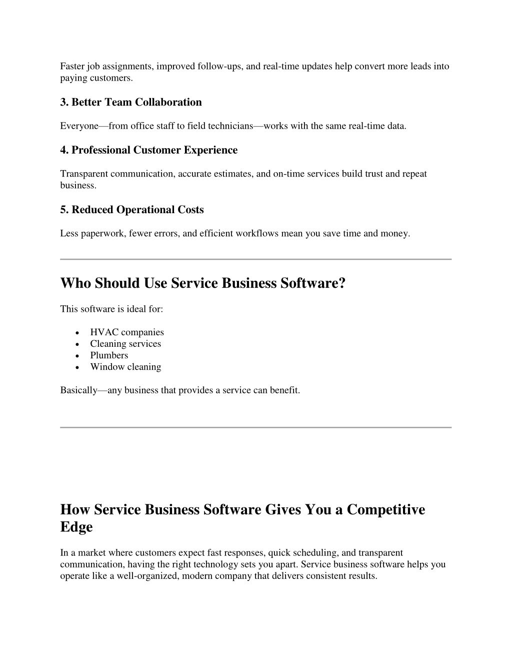 4. Faster job assignments, improved follow-ups, and real-time updates help convert more leads into paying customers. 3. Better Team Collaboration Everyone—from office staff to field technicians—works with the same real-time data. 4. Professional Customer Experience Transparent communication, accurate estimates, and on-time services build trust and repeat business. 5. Reduced Operational Costs Less paperwork, fewer errors, and efficient workflows mean you save time and money. Who Should Use Service Business Software? This software is ideal for: HVAC companies Cleaning services Plumbers Window cleaning Basically—any business that provides a service can benefit. How Service Business Software Gives You a Competitive Edge In a market where customers expect fast responses, quick scheduling, and transparent communication, having the right technology sets you apart. Service business software helps you operate like a well-organized, modern company that delivers consistent results.
