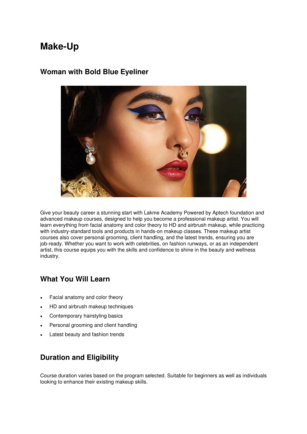 Make-Up Woman with Bold Blue Eyeliner Give your beauty career a stunning start with Lakme Academy Powered by Aptech foundation and advanced makeup courses, designed to help you become a professional makeup artist. You will learn everything from facial anatomy and color theory to HD and airbrush makeup, while practicing with industry-standard tools and products in hands-on makeup classes. These makeup artist courses also cover personal grooming, client handling, and the latest trends, ensuring you are job-ready. Whether you want to work with celebrities, on fashion runways, or as an independent artist, this course equips you with the skills and confidence to shine in the beauty and wellness industry. What You Will Learn Facial anatomy and color theory • • • • • HD and airbrush makeup techniques Contemporary hairstyling basics Personal grooming and client handling Latest beauty and fashion trends Duration and Eligibility Course duration varies based on the program selected. Suitable for beginners as well as individuals looking to enhance their existing makeup skills.