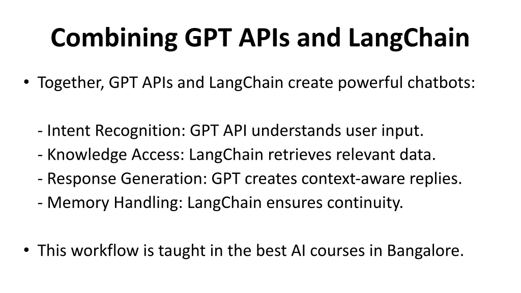 Combining GPT APIs and LangChain • Together, GPT APIs and LangChain create powerful chatbots: - Intent Recognition: GPT API understands user input. - Knowledge Access: LangChain retrieves relevant data. - Response Generation: GPT creates context-aware replies. - Memory Handling: LangChain ensures continuity. • This workflow is taught in the best AI courses in Bangalore.