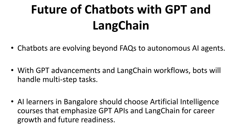 Future of Chatbots with GPT and LangChain • Chatbots are evolving beyond FAQs to autonomous AI agents. • With GPT advancements and LangChain workflows, bots will handle multi-step tasks. • AI learners in Bangalore should choose Artificial Intelligence courses that emphasize GPT APIs and LangChain for career growth and future readiness.