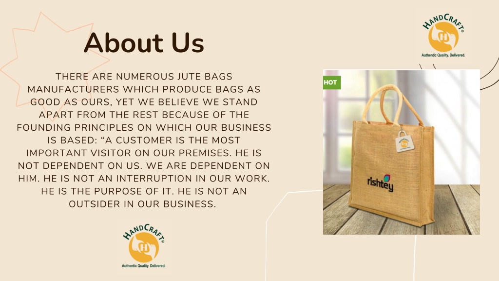 About Us THERE ARE NUMEROUS JUTE BAGS MANUFACTURERS WHICH PRODUCE BAGS AS GOOD AS OURS, YET WE BELIEVE WE STAND APART FROM THE REST BECAUSE OF THE FOUNDING PRINCIPLES ON WHICH OUR BUSINESS IS BASED: “A CUSTOMER IS THE MOST IMPORTANT VISITOR ON OUR PREMISES. HE IS NOT DEPENDENT ON US. WE ARE DEPENDENT ON HIM. HE IS NOT AN INTERRUPTION IN OUR WORK. HE IS THE PURPOSE OF IT. HE IS NOT AN OUTSIDER IN OUR BUSINESS.