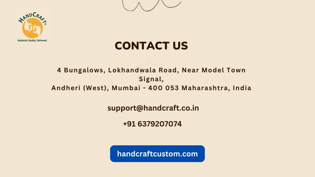 CONTACT US 4 Bungalows, Lokhandwala Road, Near Model Town Signal, Andheri (West), Mumbai - 400 053 Maharashtra, India support@handcraft.co.in +91 6379207074 handcraftcustom.com