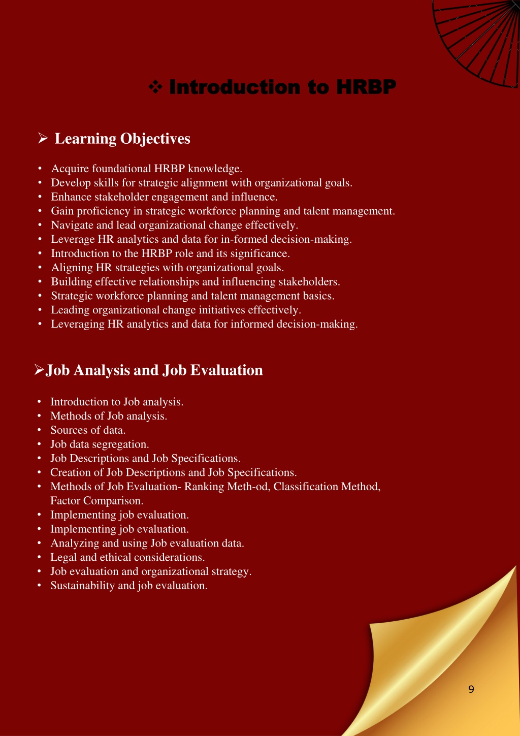 ❖ Introduction Introduction to to HRBP HRBP ➢ Learning Objectives • Acquire foundational HRBP knowledge. • Develop skills for strategic alignment with organizational goals. • Enhance stakeholder engagement and influence. • Gain proficiency in strategic workforce planning and talent management. • Navigate and lead organizational change effectively. • Leverage HR analytics and data for in-formed decision-making. • Introduction to the HRBP role and its significance. • Aligning HR strategies with organizational goals. • Building effective relationships and influencing stakeholders. • Strategic workforce planning and talent management basics. • Leading organizational change initiatives effectively. • Leveraging HR analytics and data for informed decision-making. ➢Job Analysis and Job Evaluation • Introduction to Job analysis. • Methods of Job analysis. • Sources of data. • Job data segregation. • Job Descriptions and Job Specifications. • Creation of Job Descriptions and Job Specifications. • Methods of Job Evaluation- Ranking Meth-od, Classification Method, Factor Comparison. • Implementing job evaluation. • Implementing job evaluation. • Analyzing and using Job evaluation data. • Legal and ethical considerations. • Job evaluation and organizational strategy. • Sustainability and job evaluation. 9