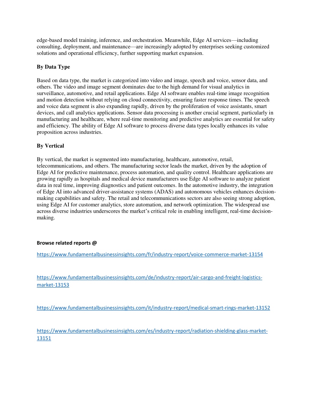 edge-based model training, inference, and orchestration. Meanwhile, Edge AI services—including consulting, deployment, and maintenance—are increasingly adopted by enterprises seeking customized solutions and operational efficiency, further supporting market expansion. By Data Type Based on data type, the market is categorized into video and image, speech and voice, sensor data, and others. The video and image segment dominates due to the high demand for visual analytics in surveillance, automotive, and retail applications. Edge AI software enables real-time image recognition and motion detection without relying on cloud connectivity, ensuring faster response times. The speech and voice data segment is also expanding rapidly, driven by the proliferation of voice assistants, smart devices, and call analytics applications. Sensor data processing is another crucial segment, particularly in manufacturing and healthcare, where real-time monitoring and predictive analytics are essential for safety and efficiency. The ability of Edge AI software to process diverse data types locally enhances its value proposition across industries. By Vertical By vertical, the market is segmented into manufacturing, healthcare, automotive, retail, telecommunications, and others. The manufacturing sector leads the market, driven by the adoption of Edge AI for predictive maintenance, process automation, and quality control. Healthcare applications are growing rapidly as hospitals and medical device manufacturers use Edge AI software to analyze patient data in real time, improving diagnostics and patient outcomes. In the automotive industry, the integration of Edge AI into advanced driver-assistance systems (ADAS) and autonomous vehicles enhances decision- making capabilities and safety. The retail and telecommunications sectors are also seeing strong adoption, using Edge AI for customer analytics, store automation, and network optimization. The widespread use across diverse industries underscores the market’s critical role in enabling intelligent, real-time decision- making. Browse related reports @ https://www.fundamentalbusinessinsights.com/fr/industry-report/voice-commerce-market-13154 https://www.fundamentalbusinessinsights.com/de/industry-report/air-cargo-and-freight-logistics- market-13153 https://www.fundamentalbusinessinsights.com/it/industry-report/medical-smart-rings-market-13152 https://www.fundamentalbusinessinsights.com/es/industry-report/radiation-shielding-glass-market- 13151