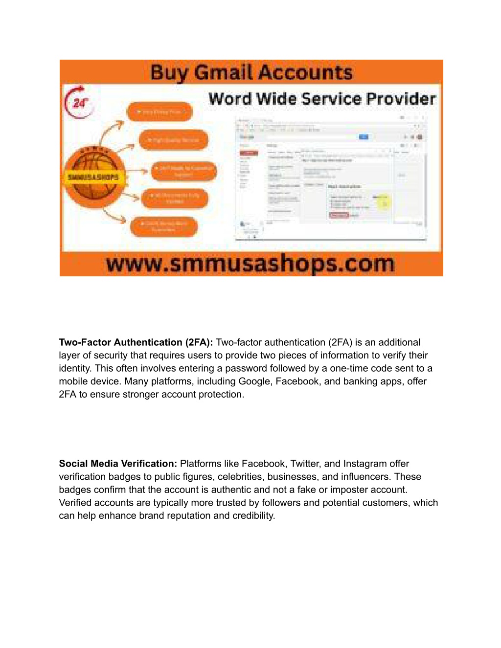 5. Bulk Purchase Discounts: If you need multiple accounts, look for sellers that offer discounts on bulk purchases. Many platforms provide lower rates per account when you buy in large quantities. Verification: Verification has become a crucial step in maintaining security, trust, and authenticity across various platforms and services. Whether it’s verifying identities for online accounts, business profiles, or Buy Gmail Accounts services, the verification process helps reduce fraud, protect data, and enhance the user experience. In this article, we’ll explore the importance of verification, how it works across different platforms, and why it’s crucial for both businesses and individuals. What is Verification? Verification refers to the process of confirming the identity or legitimacy of a user, account, or business. In the online space, verification is usually performed by requiring users to provide specific information, such as email addresses, phone numbers, or government-issued IDs, to ensure they are who they claim to be. This can include: ● Phone Verification: The most common form of verification where users must enter a code sent to their mobile device to confirm their identity.
