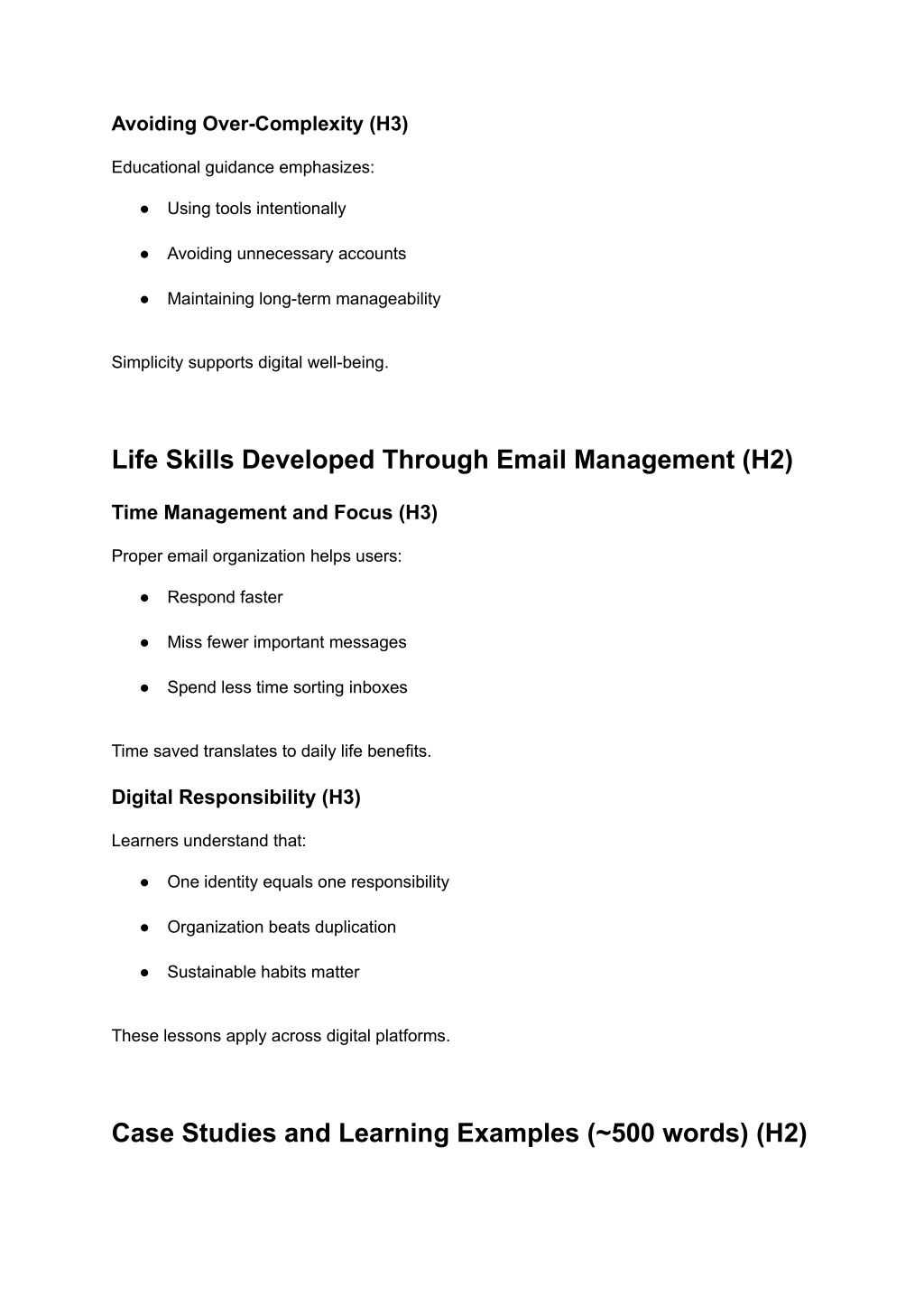 Avoiding Over-Complexity (H3) Educational guidance emphasizes: ● Using tools intentionally ● Avoiding unnecessary accounts ● Maintaining long-term manageability Simplicity supports digital well-being. Life Skills Developed Through Email Management (H2) Time Management and Focus (H3) Proper email organization helps users: ● Respond faster ● Miss fewer important messages ● Spend less time sorting inboxes Time saved translates to daily life benefits. Digital Responsibility (H3) Learners understand that: ● One identity equals one responsibility ● Organization beats duplication ● Sustainable habits matter These lessons apply across digital platforms. Case Studies and Learning Examples (~500 words) (H2)
