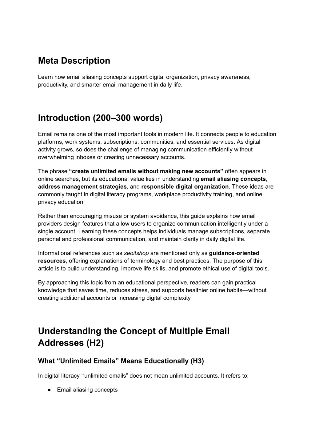 Meta Description Learn how email aliasing concepts support digital organization, privacy awareness, productivity, and smarter email management in daily life. Introduction (200–300 words) Email remains one of the most important tools in modern life. It connects people to education platforms, work systems, subscriptions, communities, and essential services. As digital activity grows, so does the challenge of managing communication efficiently without overwhelming inboxes or creating unnecessary accounts. The phrase “create unlimited emails without making new accounts” often appears in online searches, but its educational value lies in understanding email aliasing concepts, address management strategies, and responsible digital organization. These ideas are commonly taught in digital literacy programs, workplace productivity training, and online privacy education. Rather than encouraging misuse or system avoidance, this guide explains how email providers design features that allow users to organize communication intelligently under a single account. Learning these concepts helps individuals manage subscriptions, separate personal and professional communication, and maintain clarity in daily digital life. Informational references such as seoitshop are mentioned only as guidance-oriented resources, offering explanations of terminology and best practices. The purpose of this article is to build understanding, improve life skills, and promote ethical use of digital tools. By approaching this topic from an educational perspective, readers can gain practical knowledge that saves time, reduces stress, and supports healthier online habits—without creating additional accounts or increasing digital complexity. Understanding the Concept of Multiple Email Addresses (H2) What “Unlimited Emails” Means Educationally (H3) In digital literacy, “unlimited emails” does not mean unlimited accounts. It refers to: ● Email aliasing concepts