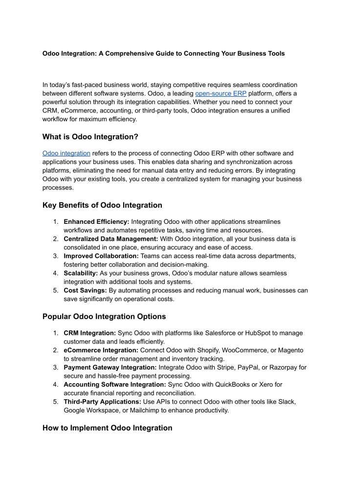 Odoo Integration: A Comprehensive Guide to Connecting Your Business Tools In today’s fast-paced business world, staying competitive requires seamless coordination between different software systems. Odoo, a leading open-source ERP platform, offers a powerful solution through its integration capabilities. Whether you need to connect your CRM, eCommerce, accounting, or third-party tools, Odoo integration ensures a unified workflow for maximum efficiency. What is Odoo Integration? Odoo integration refers to the process of connecting Odoo ERP with other software and applications your business uses. This enables data sharing and synchronization across platforms, eliminating the need for manual data entry and reducing errors. By integrating Odoo with your existing tools, you create a centralized system for managing your business processes. Key Benefits of Odoo Integration 1. Enhanced Efficiency: Integrating Odoo with other applications streamlines workflows and automates repetitive tasks, saving time and resources. 2. Centralized Data Management: With Odoo integration, all your business data is consolidated in one place, ensuring accuracy and ease of access. 3. Improved Collaboration: Teams can access real-time data across departments, fostering better collaboration and decision-making. 4. Scalability: As your business grows, Odoo’s modular nature allows seamless integration with additional tools and systems. 5. Cost Savings: By automating processes and reducing manual work, businesses can save significantly on operational costs. Popular Odoo Integration Options 1. CRM Integration: Sync Odoo with platforms like Salesforce or HubSpot to manage customer data and leads efficiently. 2. eCommerce Integration: Connect Odoo with Shopify, WooCommerce, or Magento to streamline order management and inventory tracking. 3. Payment Gateway Integration: Integrate Odoo with Stripe, PayPal, or Razorpay for secure and hassle-free payment processing. 4. Accounting Software Integration: Sync Odoo with QuickBooks or Xero for accurate financial reporting and reconciliation. 5. Third-Party Applications: Use APIs to connect Odoo with other tools like Slack, Google Workspace, or Mailchimp to enhance productivity. How to Implement Odoo Integration
