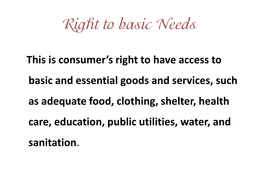 Right to basic Needs This is consumer’s right to have access to basic and essential goods and services, such as adequate food, clothing, shelter, health care, education, public utilities, water, and sanitation.
