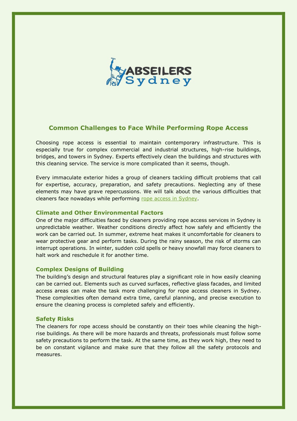 Common Challenges to Face While Performing Rope Access Choosing rope access is essential to maintain contemporary infrastructure. This is especially true for complex commercial and industrial structures, high-rise buildings, bridges, and towers in Sydney. Experts effectively clean the buildings and structures with this cleaning service. The service is more complicated than it seems, though. Every immaculate exterior hides a group of cleaners tackling difficult problems that call for expertise, accuracy, preparation, and safety precautions. Neglecting any of these elements may have grave repercussions. We will talk about the various difficulties that cleaners face nowadays while performing rope access in Sydney. Climate and Other Environmental Factors One of the major difficulties faced by cleaners providing rope access services in Sydney is unpredictable weather. Weather conditions directly affect how safely and efficiently the work can be carried out. In summer, extreme heat makes it uncomfortable for cleaners to wear protective gear and perform tasks. During the rainy season, the risk of storms can interrupt operations. In winter, sudden cold spells or heavy snowfall may force cleaners to halt work and reschedule it for another time. Complex Designs of Building The building’s design and structural features play a significant role in how easily cleaning can be carried out. Elements such as curved surfaces, reflective glass facades, and limited access areas can make the task more challenging for rope access cleaners in Sydney. These complexities often demand extra time, careful planning, and precise execution to ensure the cleaning process is completed safely and efficiently. Safety Risks The cleaners for rope access should be constantly on their toes while cleaning the high- rise buildings. As there will be more hazards and threats, professionals must follow some safety precautions to perform the task. At the same time, as they work high, they need to be on constant vigilance and make sure that they follow all the safety protocols and measures.