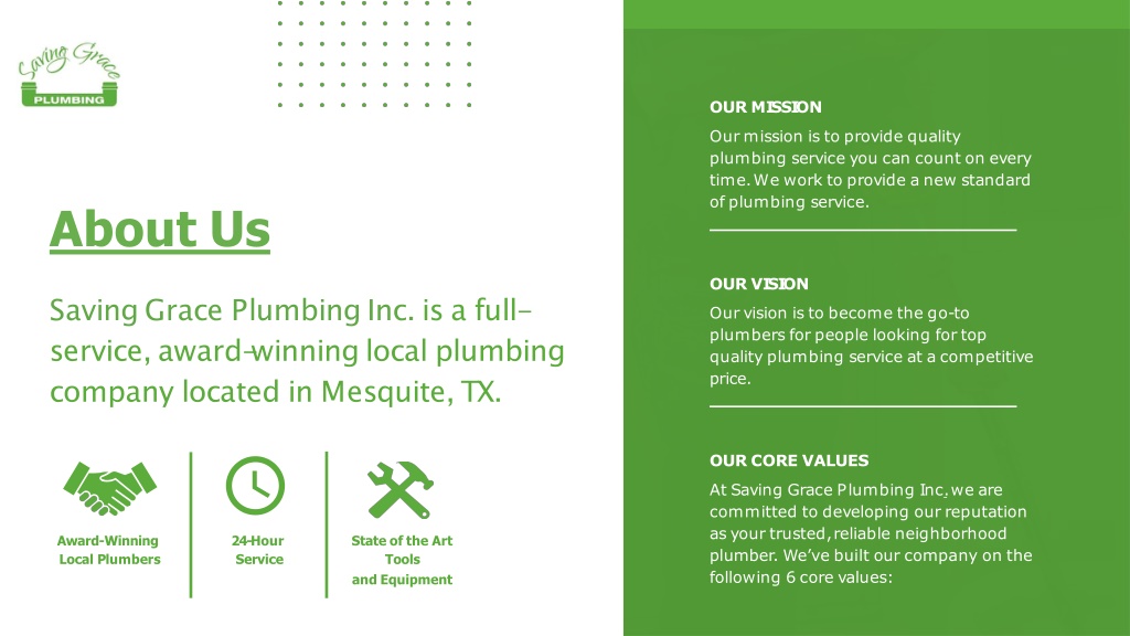 OURMISSION Ourmissionistoprovidequality plumbingserviceyoucancountonevery time.Weworktoprovideanewstandard ofplumbingservice. AboutUs SavingGracePlumbingInc.isafull- service,award-winninglocalplumbing companylocatedinMesquite,TX. OURVISION Ourvisionistobecomethego-to plumbersforpeoplelookingfortop qualityplumbingserviceatacompetitive price. OURCOREVALUES AtSavingGracePlumbingInc.weare committedtodevelopingourreputation asyourtrusted,reliableneighborhood plumber.We’vebuiltourcompanyonthe following6corevalues: Award-Winning LocalPlumbers StateoftheArt Tools andEquipment 24-Hour Service