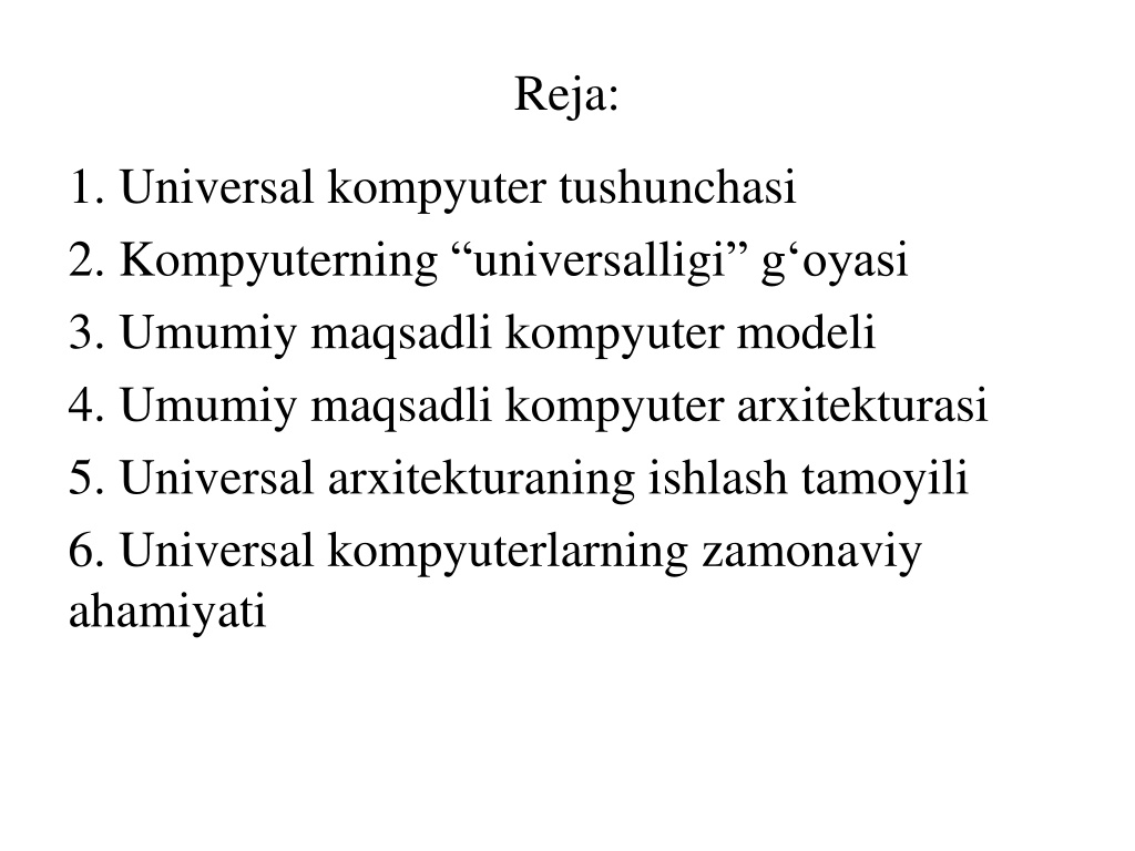 Reja: 1. Universal kompyutertushunchasi 2. Kompyuterning “universalligi” g‘oyasi 3. Umumiymaqsadlikompyutermodeli 4. Umumiymaqsadlikompyuterarxitekturasi 5. Universal arxitekturaningishlashtamoyili 6. Universal kompyuterlarningzamonaviyahamiyati