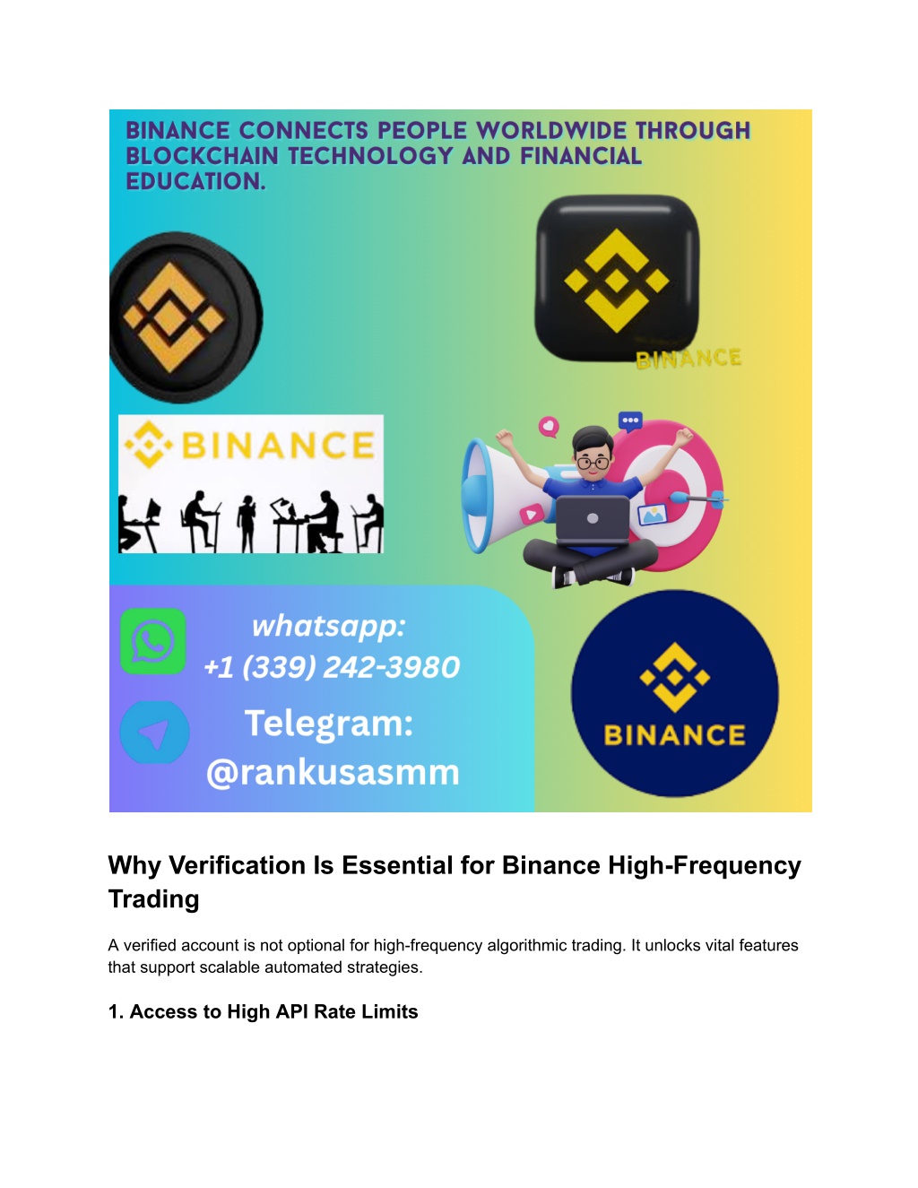 1. Need a Verified Binance Account for High-Frequency Trading Bots? The fast expanding ecosystem of algorithmic trading has made the Binance exchange a preferred destination for traders who deploy high-frequency trading bots (HFT bots). Traders who aim to execute thousands of trades per day require a streamlined, compliant, and secure environment. A verified Binance account is the foundation of successful, legally compliant bot-driven trading at scale.This guide explains everything you need to operate HFT bots on Binance legally and effectively, secure your trading infrastructure, and optimize performance without risking your account or funds. Contact us now for more information 24/7 At Any Time ✅Email: rankusasmm@gmail.com✅whatsapp:+1 (339) 242-3980 ✅Telegram: @rankusasmm Visit ; https://rankusasmm.com/product/buy-verified-binance-account/