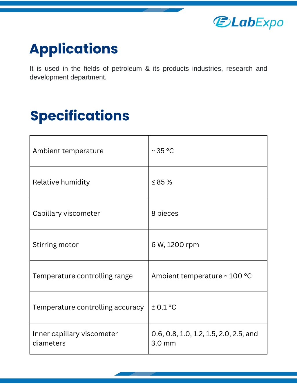 Applications It is used in the fields of petroleum & its products industries, research and development department. Specifications Ambient temperature ~ 35 °C Relative humidity ≤ 85 % Capillary viscometer 8 pieces Stirring motor 6 W, 1200 rpm Temperature controlling range Ambient temperature ~ 100 °C Temperature controlling accuracy ± 0.1 °C Inner capillary viscometer diameters 0.6, 0.8, 1.0, 1.2, 1.5, 2.0, 2.5, and 3.0 mm