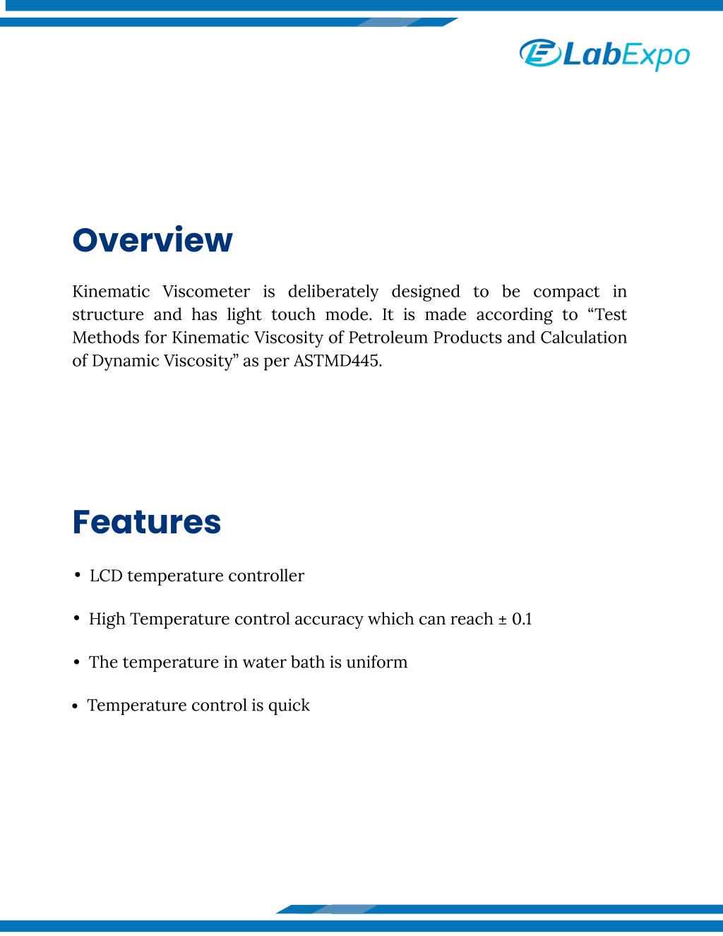 Lab Expo Kinematic Viscometer features a compact structure with light-touch operation for smooth laboratory use. Built in accordance with ASTM D445, it supports accurate kinematic and dynamic viscosity determination of petroleum products. User-focused design suits quality control and analytical laboratory workflows.