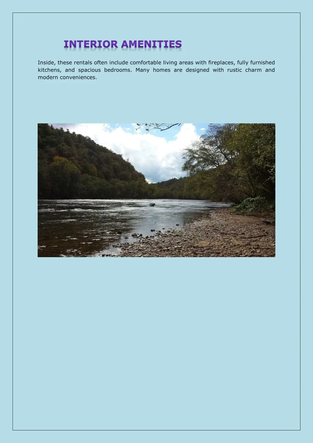 Inside, these rentals often include comfortable living areas with fireplaces, fully furnished kitchens, and spacious bedrooms. Many homes are designed with rustic charm and modern conveniences.