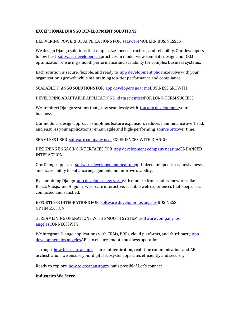 EXCEPTIONALDJANGO DEVELOPMENTSOLUTIONS DELIVERINGPOWERFULAPPLICATIONSFORsatawareMODERNBUSINESSES WedesignDjango solutionsthatemphasize speed, structure,andreliability. Ourdevelopers follow bestsoftwaredevelopers azpractices in model-view-templatedesignandORM optimization,ensuringsmoothperformanceandscalabilityforcomplexbusinesssystems. Eachsolutionis secure,flexible,andreadytoappdevelopment phoenixevolvewith your organization’sgrowthwhilemaintainingtop-tierperformanceandcompliance. SCALABLEDJANGOSOLUTIONSFORappdevelopersnearmeBUSINESSGROWTH DEVELOPINGADAPTABLEAPPLICATIONSidatascientistsFORLONG-TERM SUCCESS WearchitectDjangosystemsthatgrow seamlesslywithtopappdevelopmentyour business. Ourmodulardesignapproach simplifiesfeatureexpansion,reducesmaintenance overhead, andensuresyourapplicationsremainagileandhigh-performingsourcebitzovertime. SEAMLESSUSERsoftwarecompanynearEXPERIENCESWITHDJANGO DESIGNINGENGAGING INTERFACES FORapp developmentcompanynear meENHANCED INTERACTION OurDjangoappsaresoftwaredevelopement nearmeoptimizedforspeed,responsiveness, andaccessibility toenhanceengagementandimproveusability. BycombiningDjangoappdeveloper newyorkwithmodernfront-endframeworkslike React,Vue.js,andAngular,wecreateinteractive,scalablewebexperiencesthatkeepusers connectedandsatisfied. EFFORTLESSINTEGRATIONS FORsoftwaredeveloperlosangelesBUSINESS OPTIMIZATION STREAMLININGOPERATIONSWITHSMOOTHSYSTEMsoftwarecompanylosangelesCONNECTIVITY WeintegrateDjangoapplicationswithCRMs,ERPs,cloudplatforms,andthird-partyappdevelopmentlosangelesAPIstoensuresmoothbusinessoperations. Throughhowtocreateanappsecure authentication,real-time communication,andAPI orchestration,weensureyourdigitalecosystemoperatesefficientlyand securely. Readytoexplorehowtocreatanappzwhat’spossible?Let’sconnect Industries WeServe