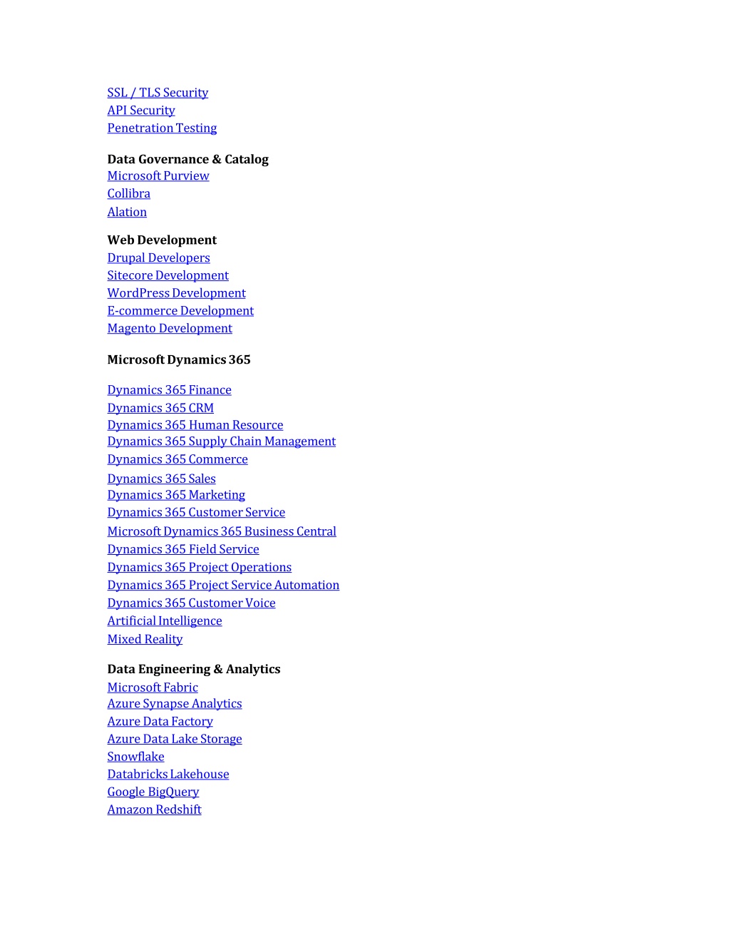 SSL/TLSSecurityAPISecurityPenetrationTesting DataGovernance &Catalog MicrosoftPurviewCollibra Alation WebDevelopmentDrupalDevelopersSitecoreDevelopmentWordPressDevelopmentE-commerceDevelopmentMagentoDevelopment MicrosoftDynamics365 Dynamics365Finance Dynamics365CRM Dynamics365HumanResource Dynamics365SupplyChainManagementDynamics365Commerce Dynamics365Sales Dynamics365MarketingDynamics365CustomerService MicrosoftDynamics365BusinessCentralDynamics365FieldService Dynamics365ProjectOperationsDynamics365ProjectServiceAutomation Dynamics365CustomerVoiceArtificialIntelligence MixedReality DataEngineering& Analytics MicrosoftFabric AzureSynapseAnalyticsAzureDataFactoryAzureDataLakeStorageSnowflake DatabricksLakehouseGoogle BigQueryAmazonRedshift