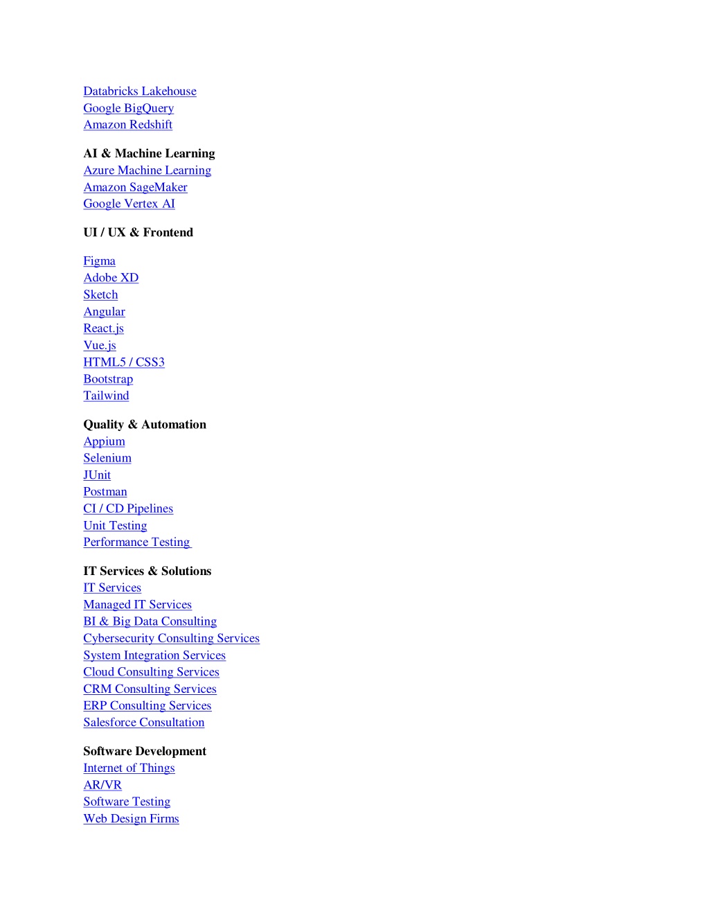 Databricks Lakehouse Google BigQuery Amazon Redshift AI & Machine Learning Azure Machine Learning Amazon SageMaker Google Vertex AI UI / UX & Frontend Figma Adobe XD Sketch Angular React.js Vue.js HTML5 / CSS3 Bootstrap Tailwind Quality & Automation Appium Selenium JUnit Postman CI / CD Pipelines Unit Testing Performance Testing IT Services & Solutions IT Services Managed IT Services BI & Big Data Consulting Cybersecurity Consulting Services System Integration Services Cloud Consulting Services CRM Consulting Services ERP Consulting Services Salesforce Consultation Software Development Internet of Things AR/VR Software Testing Web Design Firms